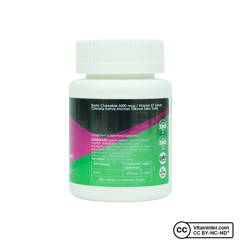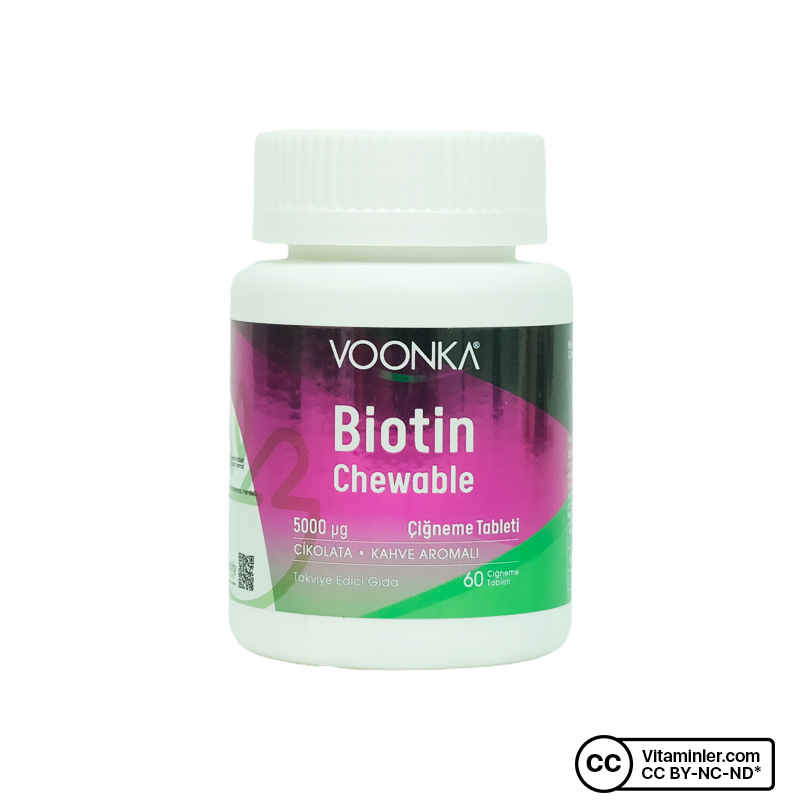 Vücudun biyotin ihtiyacını karşılamak amacıyla üretilen Voonka Biotin; her tablette 5000 mcg biyotin, diğer adıyla B7 vitamini takviyesi sunan bir gıda takviyesidir. Yüksek biyotin değeriyle günlük ihtiyacın %10000’i gibi yüksek bir oranda karşılayan ürün, tablet yutmakta zorluk yaşayanlar için çiğnenebilir formda üretilmiştir. Çikolata ve kahve aromalarıyla zenginleştirilen Voonka biyotin takviyesi, keyifli bir tüketim sağlar. Aynı zamanda 62 kullanımlık yüksek servis imkanıyla uzun ömürlü bir tüketim sunar.