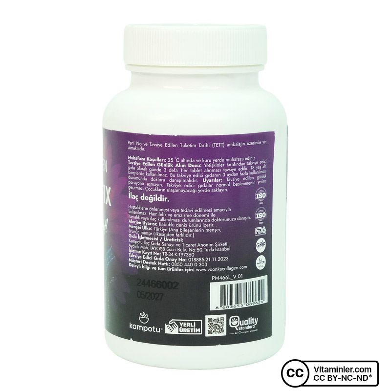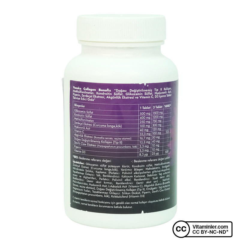 Voonka Collagen Bonafix 90 Tablet, Kollajen içeriğine ek olarak Glikozamin, Kondroitin, MSM, Zerdeçal, Şeytan Pençesi, Piperin, Hyarulonik Asit, Akgünlük ekstresi, C vitamini ve D3 vitamini içerir. Bitkisel ekstrelerle desteklenmiştir.