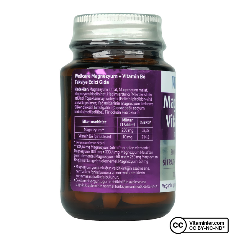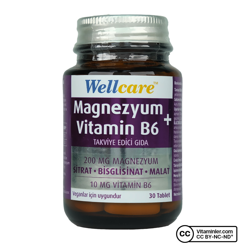 Wellcare Magnezyum Vitamin B6; tek tablette 200 mg elemental magnezyum ile 10 mg B6 vitamini sunar. Renklendirici, koruyucu ve gluten içermeyen formülü, farklı magnezyum kaynaklarını tek bir tablette buluşturur. İçeriğindeki magnezyum desteği; 100 mg sitrat, 50 mg malat ve 50 mg bisglisinat olmak üzere üç farklı formun kombinasyonundan oluşur.